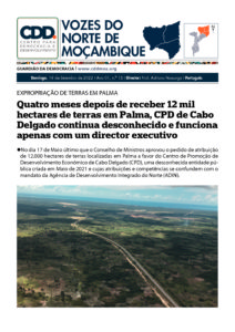 18/09/2022 By admin Comment off Quatro meses depois de receber 12 mil hectares de terras em Palma, CPD de Cabo Delgado continua desconhecido e funciona apenas com um director executivo